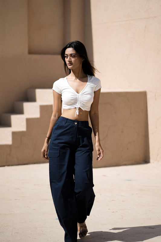 Women’s Wide-Leg Cargo Pants with Back Belt Navy
