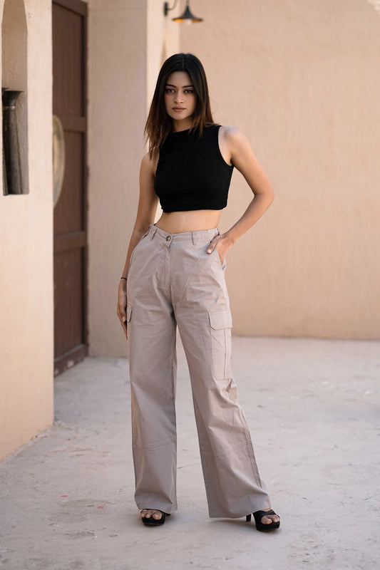 Women’s Wide-Leg Cargo Pants with Back Belt Grey