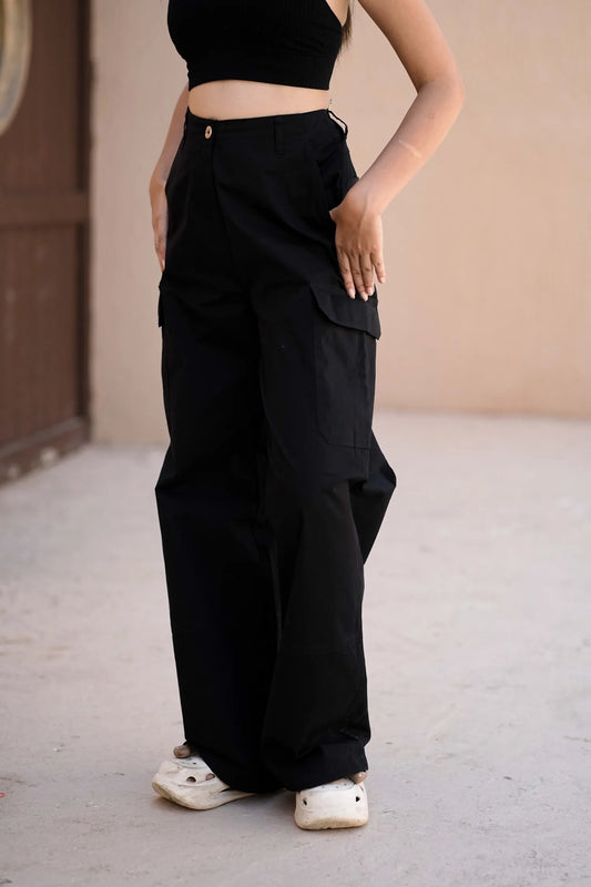 Women’s Wide-Leg Cargo Pants with Back Belt Black