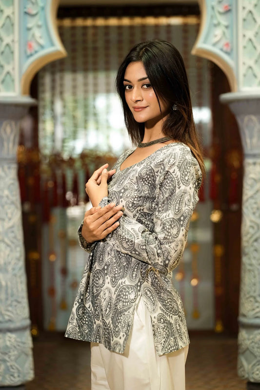 Women’s Grey Paisley Printed Long Sleeve Kurti