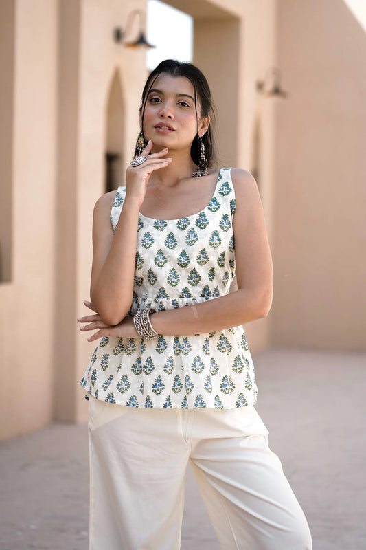 Women’s White and Blue Floral Cotton Sleeveless Peplum Kurti