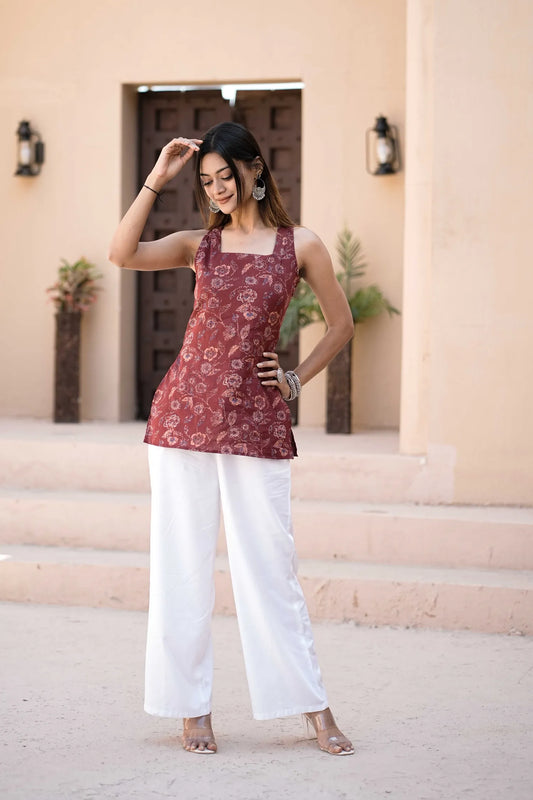 Women’s Maroon Floral Cotton Sleeveless Kurti